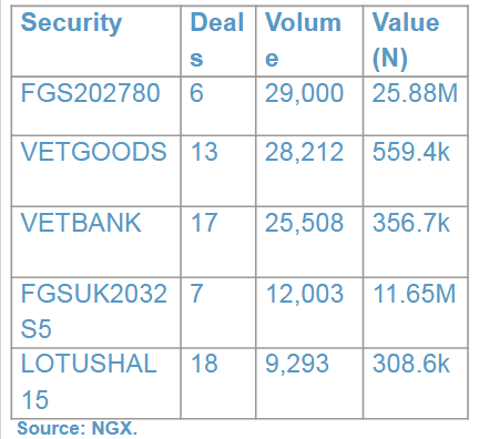 This week, a total of 70,218 units worth N4.016 million were traded in 113 deals, compared to last week’s 56,372 units valued at N6,280 million, which were transacted in 99 deals.